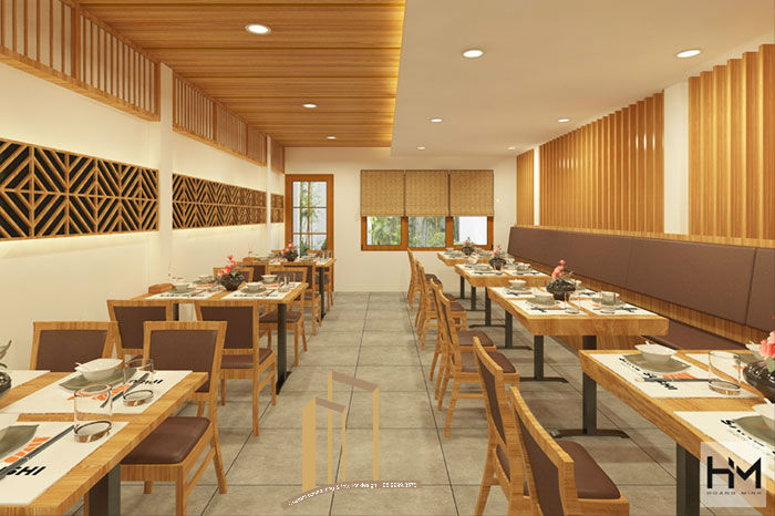 Sự tính toán chi tiết trong việc bố trí nội thất không gian ăn uống thoáng đãng thu hút khách hàng nhưng vẫn tối đa được vị trí chỗ ngồi giúp tăng doanh thu cho nhà hàng.