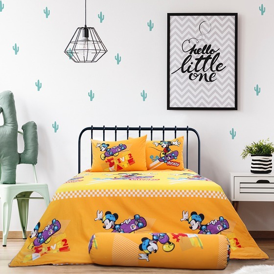 Bộ drap chuột Mickey Sông Hồng kích thước 1,6 m x 2 m có màu chủ đạo là vàng tươi sáng, phù hợp cho cả bé trai lẫn bé gái. Họa tiết in rõ nét trên bề mặt vải cotton thoáng mát, thấm hút mồ hôi. Giá cho bộ drap chần bông, chăn đắp cùng hai vỏ gối nằm.
